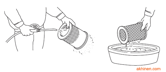 Bước 6 (lọc dính dầu/carbon): Ngâm lọc trong dung dịch tẩy rửa phù hợp hoặc nước khoảng 30 phút, sau đó rửa lại bằng nước sạch vài lần. Lưu ý áp suất nước nên ở mức thấp (không xịt mạnh) và làm khô hoàn toàn trước khi lắp lại.